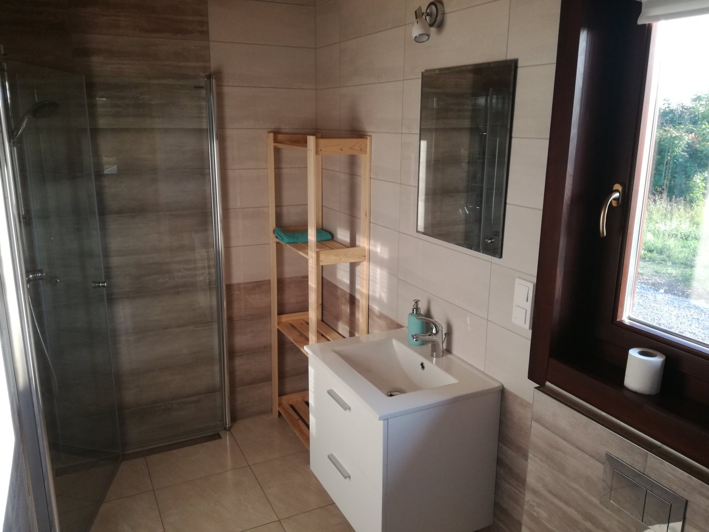 Łazienka z prysznicem, umywalką i WC;